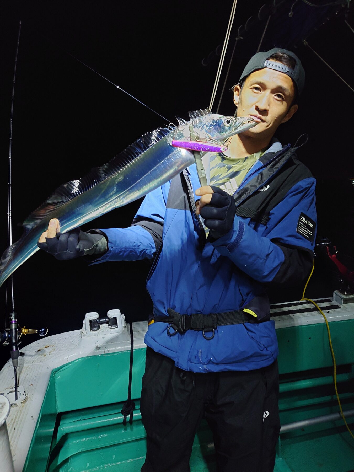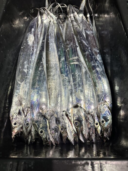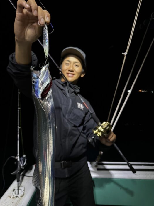 夕方便、深夜便出船しました。本日は両便ともに反応もよく船の下にはベイトやタチウオが沢山集まってはいましたが、魚のご機嫌は斜め…難しいやり取りが続きました。それでも、パターンにハマった方は40本オーバーとそこそこの数にはなりました。魚探の反応だけ見ていれば魚影は濃く映りましたのでどこかでスイッチ入れば盛り上がりをみせると思います。ジギングでは5本指の立派なタチウオもあがりました。